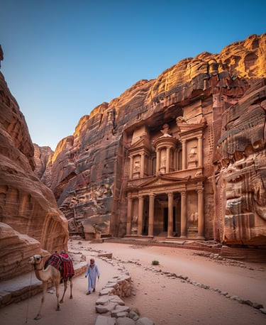 Petra adalah kota kuno yang diukir langsung dari tebing batu merah. Dulunya merupakan pusat perdagangan penting, kini dikenal sebagai "Kota Mawar" dan merupakan situs arkeologi yang sangat megah.